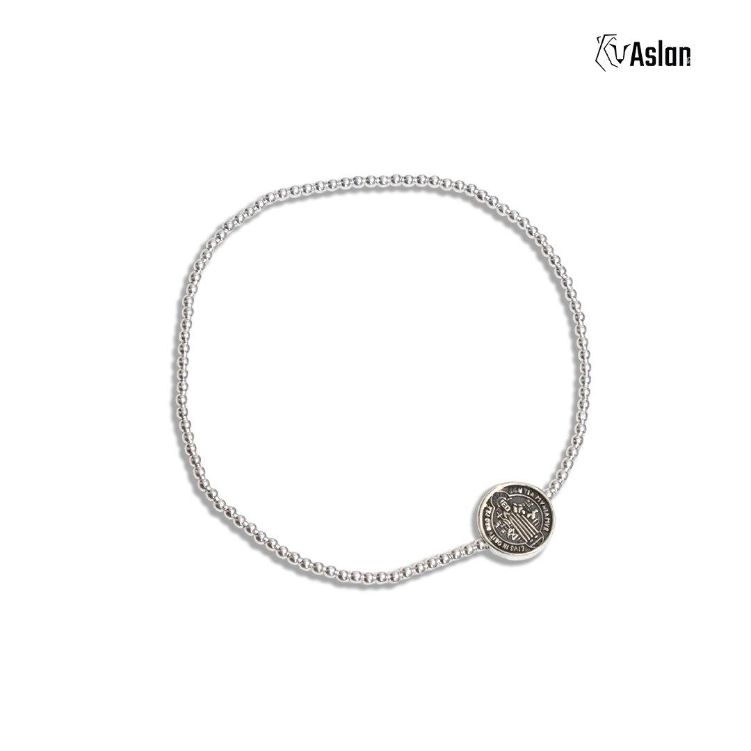 Diseño minimalista con carácter. Esta pulsera de plata ley .925 combina esferas de 1.8 mm con un dije cilíndrico estilo tambor grabado con el sello de San Benito, reconocido por su simbolismo protector. Disponible en largos de 16, 18 y 20 cm, es una pieza que acompaña con sobriedad y fuerza, perfecta para quien aprecia el detalle con historia.